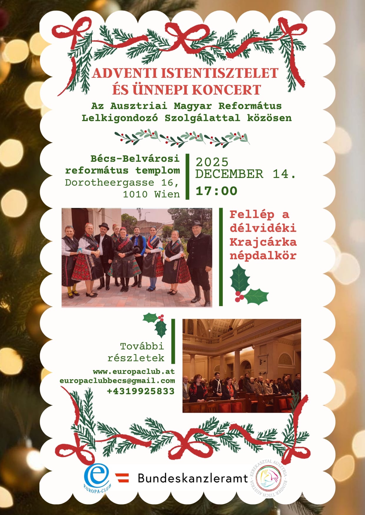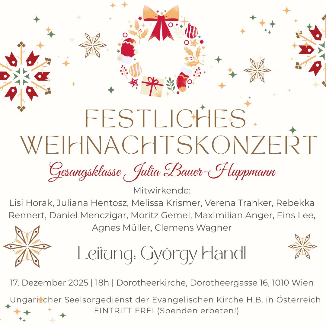 | 2025. december | 17. | du. 18 óra: | Karácsonyváró koncert – Fellépneka bécsi Zeneakadémia növendékei |